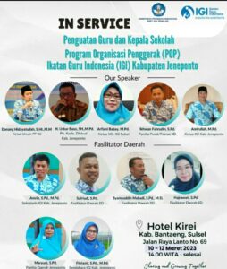 Penguatan guru dan kepala sekolah program organisasi penggerak IGI Kabupaten Jeneponto diikuti 45 Kepala Sekolah dan Guru dari sekolah yang menjadi sasaran Program Organisasi Penggerak Ikatan Guru Indonesia Kabupaten Jeneponto.
