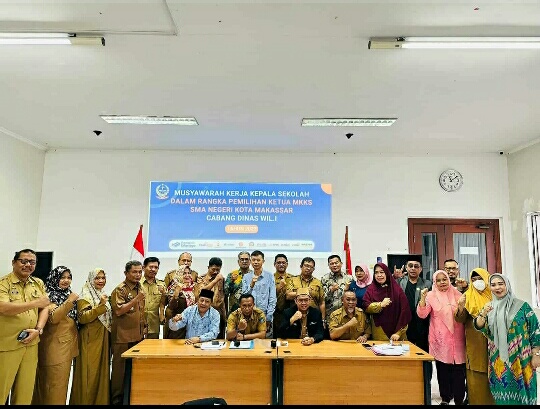 Pemilihan Ketua Musyawarah Kerja Kepala Sekolah (MKKS) SMA Negeri Kota Makassar berlangsung di Gedung Erlangga, Lantai 2, Jalan Hertasning, Selasa (18/04/2023).